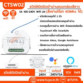 CTSW01 สวิต์ซ์เปิดปิดผ้าม่านแบบกล่องสีขาว IP20 3A 100-240V Wifi 2.4GHz LN • สวิตซ์ควบคุมได้ 2 ตัว ต่อตรงกับมอเตอร์แกนหมุนผ้าม่าน ใช้ได้หลากหลายเช่นม่านลอน ม่านจีบ ม่านม้วนฯลฯ • ควบคุมสั่งการผ่าน WiFi ด้วยแอปพลิเคชัน TuyaSmart หรือ SmartLife ผ่านโทรศัพท์มือถือใช้ได้กับระบบปฏิบัติการ iOS และ Android และแชร์การทำงานร่วมกับคนในครอบครัว • รองรั..