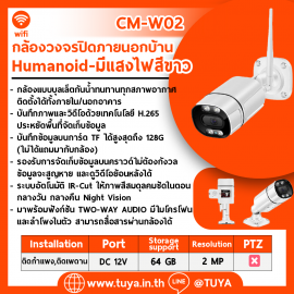 CM-W02 กล้องวงจรปิดไร้สายนอกบ้าน กันน้ำ 2MP IP65 H.265 12V 128G คุณสมบัติผลิตภัณฑ์• กล้องแบบบุลเล็ตกันน้ำทนทานทุกสภาพอากาศ ติดตั้งได้ทั้งภายใน/นอกอาคารเช่น โรงเรียน, บ้าน, สำนักงาน, ร้านค้า และสามารถติดตั้งง่ายได้ด้วยตัวเอง • ระบบจับภาพเคลื่อนไหวอัตโนมัติ (AI) เมื่อตรวจเจอการบุกรุกแสงไฟสีขาวจะส่องสว่าง 30 วินาทีและสัญญาณเตือนจะดังขึ้นพร้อมส่งข้อ..